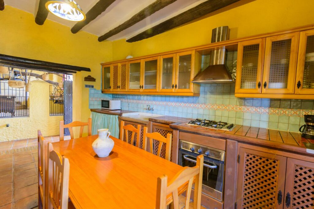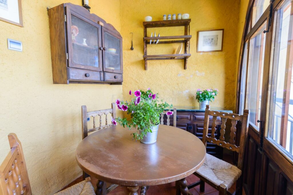 Junto a la cocina encontramos una puerta de acceso a un acogedor patio exterior con parte de los muros existentes de piedra, donde está la piscina de agua salada, una zona con mesa y sillas para poder almorzar y una pequeña parte de césped para el disfrute de los más pequeños.